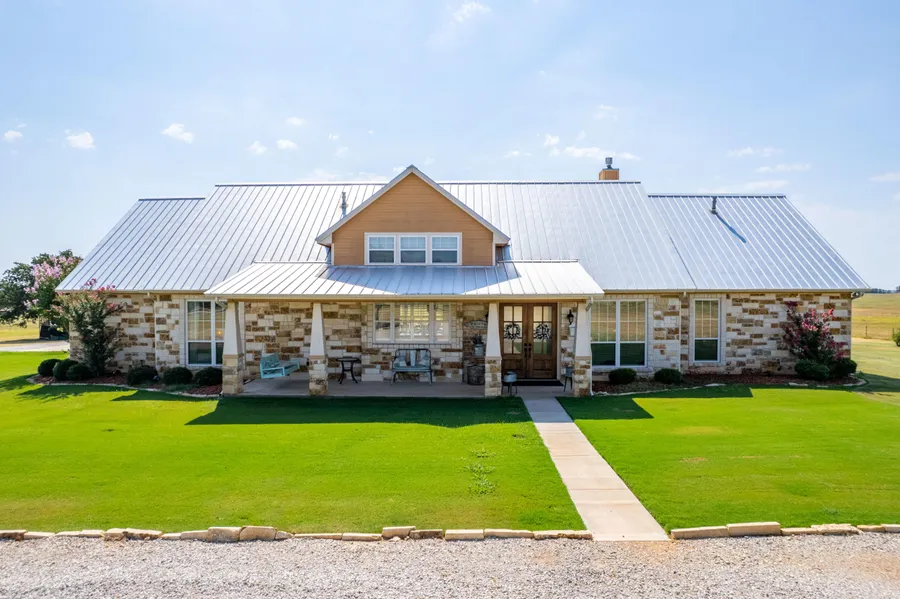 A stunning piece of paradise 37.5 acres partly fenced awaits in De Leon, TX. The stoned entryway attached to the top rail net fencing travels along the front of the property. The gravel drive leads you to the 2 car garage, an insulated shop-covered barn, a water well, or a circle drive. Entering into this 2-story home you quickly see the open layout it offers. The home includes 2 AC units with 2 zones on each, a heat pump AC electric unit, 2 tankless water heaters as well as a pelican whole house water filtration system, and city utilities throughout. The kitchen has large spacious cabinets, a walk-in pantry, an under counter ice maker, a Sub Zero Jenn Air Fridge, an Induction Cooktop, Double Oven, and much more. The master suite has a walk-in closet with builtins, a master bath with a walk in shower and a jacuzzi tub. The 2nd story includes an upstairs loft that sleeps 7. Lastly, on the covered back patio area you have a large open space to relax while enjoying the breathtaking views.