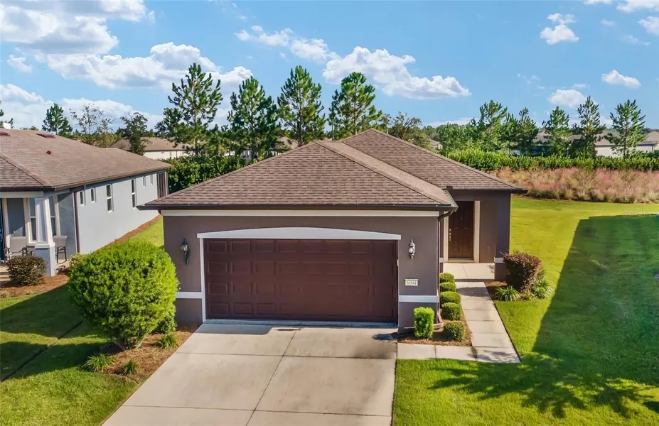 Carefree living begins here in this beautifully maintained 3-bedroom, 2-bath Crestview model, nestled on a premium lot within the gated 55+ Stone Creek Golf Course Community. With an extended garage and lanai, this home offers extra space for hobbies, guests, and relaxed outdoor living surrounded by resort-style amenities designed for your enjoyment. The inviting entry foyer sets the stage for welcoming family and friends into this light and bright, open living space with thoughtful upgrades including 2 panel Cheyenne style doors and 2" faux wood fin blinds throughout and an added bedroom providing great space for guests or a hobby room. Entertaining is a breeze with the connecting Living and Dining Room areas with an eye-pleasing neutral color palette, transom windows offering great natural lighting, and easy-to-maintain tile flooring. The nicely equipped kitchen offers a stainless appliance package, quartz countertops, a glass tile accented backsplash, a spot-resistant Moen faucet, a large island with bar-height seating, and an added buffet area for your extra preparation and storage needs. The kitchen area also features expansive glass sliders opening to a screened-in and expanded lanai with recessed lighting overlooking a landscaped nature berm with no neighbors directly behind. The Owner's suite features a triple window offering more great natural lighting and an ensuite bath with a step-in shower, large double sink vanity, and a spacious walk-in closet. More great extras include a SECO-installed surge mitigator, pre-plumbed for a home water softener system, pull-down stairs in the garage for access to attic storage space, upgraded bathroom fixtures, updated laundry room, and Coolaroo custom made exterior sunshades on the lanai. Best of all, lawn care is handled for you so you can spend your days enjoying the community’s golf course, resort-style pools, sports courts, health spa, social events, and scenic outings. Whether you're relaxing at home or exploring everything Stone Creek has to offer, this is the lifestyle you've been waiting for!