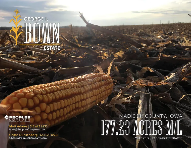 Farmland in Madison County, Iowa has a proud history of agriculture distinction and the Bown Farm is no different as the late George & Marilyn Bown raised corn, soybeans, hay, hogs, and cattle since taking ownership in 1962. Peoples Company is pleased to be representing the heirs of the George I. Bown Estate in the sale of their almost 60 year family-owned farmland located northwest of Winterset and south of Earlham in Madison County. The land consists of a total of 177.23 acres m/l and will be sold as two individual tracts. The auction will take place at the Earlham Community Building in Earlham, Iowa on Thursday, February 13th, 2020 at 10:00 AM. The soil types on this farmland portfolio are primarily high producing Sharpsburg silty clay loam with CSR2 values well above the county average of 60.8.
