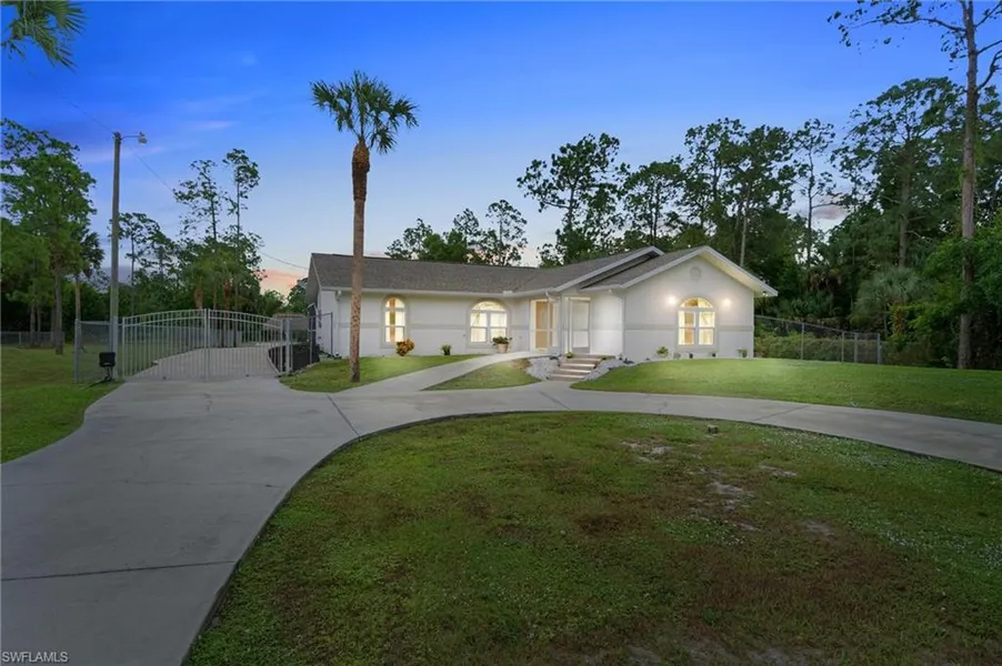 PEACEFUL GOLDEN GATE ESTATES LIVING...be close to town and still enjoy your privacy! 3 bed/2 bath/inground pool home features a separate hurricane rated 30x40 workshop building with a 5-ton AC unit, plumbing and electric. Fully fenced backyard with electric gate and a large custom Seminole Indian built tiki hut with electric, plumbing and fire suppressant. The home has a huge kitchen with added cabinets, separate breakfast bar and a formal dining room. Laundry room is conveniently off the kitchen. Sliders lead out to your lanai and screened inground pool. Large living room with barn doors. Large owner's suite with a spa-like bath with jacuzzi tub and separate shower, new vanity with granite countertop. Two additional spacious bedrooms share a full bath and tiled shower. New luxury vinyl flooring installed in 2023. Roof and AC replaced in 2022, all new impact resistant doors and windows in 2022, windows have transferrable warranty. Workshop with 2 bay doors, one door is electric, and the 2nd door is manual, approximately 9,000 sqft of pavers- plenty of room! NO HOA!!