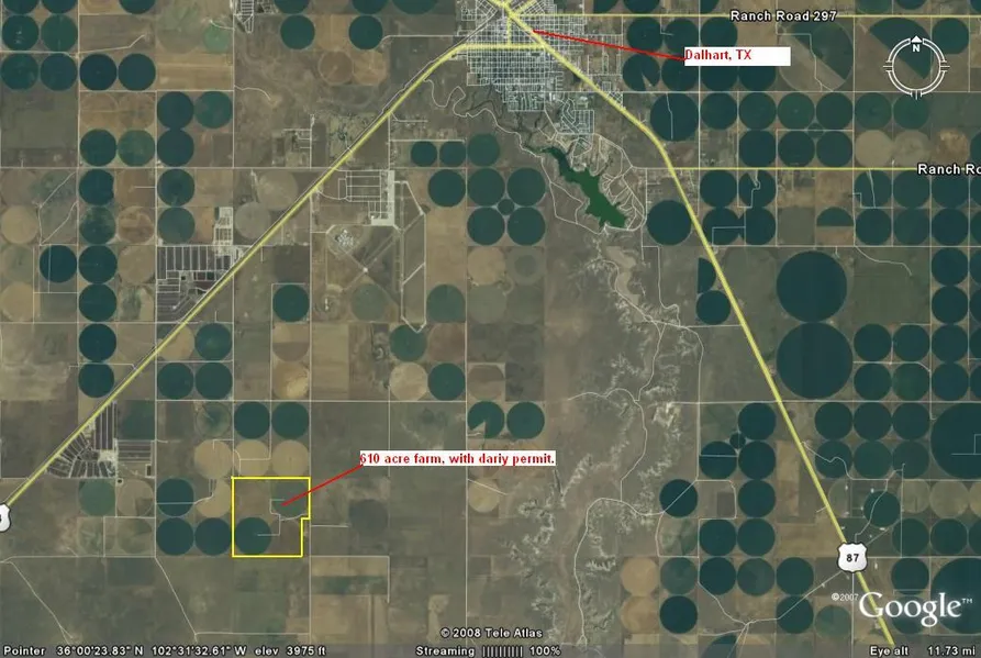 Full Description: 610 acres in this irrigated farm located approximately 7 miles southwest of Dalhart. There are 4 circles, 4 pivots and 4 wells on this farm with highway frontage and a dairy permit. This property includes the existing wheat crop and manure applied on the corn ground.