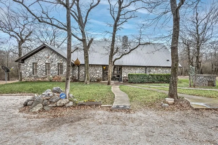 Perfect country living! Situated on 8.8 acres, this well-maintained 3-bedroom, 2-bath property offers the space, privacy, and peaceful setting many buyers are searching for, tucked away among the trees with abundant wildlife. The living room is anchored by a wood-burning fireplace with blowers, complemented by custom built-in bookshelves and cabinetry, while wood plantation shutters, vaulted ceilings, and updated lighting create an open yet comfortable atmosphere with the ability to set a more intimate mood. Just off the living area, the formal dining room provides ideal space for entertaining and flows seamlessly into the kitchen for everyday functionality. The updated kitchen features knotty alder cabinetry, granite countertops, a center island with electric cooktop and breakfast bar, and stainless steel appliances approximately four years old, along with ample room for a breakfast table, impressive pantry storage, and a built-in desk nook. An oversized laundry room doubles as a functional workspace and offers generous storage and a utility sink. The primary bedroom easily accommodates large furniture and includes an ensuite with dual sinks, a separate makeup vanity, jetted tub, and walk-in closet. A spiral staircase leads to a loft overlooking the bedroom, currently used as a home office, complete with custom built-ins and a wet bar, with all loft furniture remaining. Two additional bedrooms are nicely sized, and the hall bathroom was remodeled approximately four years ago. The home is supported by 21 concrete piers beneath the slab and includes a basement measuring approximately 14 x 16 , offering additional usable space with built-in bunk beds and a large gun safe that will remain. Recent updates include a two-year-old HVAC system, new septic lines, new interior doors, a kitchen water filtration system, and a whole-house water softener. A detached two-car garage with a 2-car carport provides substantial storage and includes partial plumbing for a future bathroom. The home is serviced by rural water but also has a water well supplying the sprinkler system. Fully fenced with wire fencing and a gated entrance, this property is well suited for buyers seeking acreage, solid construction, and a quiet country lifestyle with thoughtful improvements already in place.