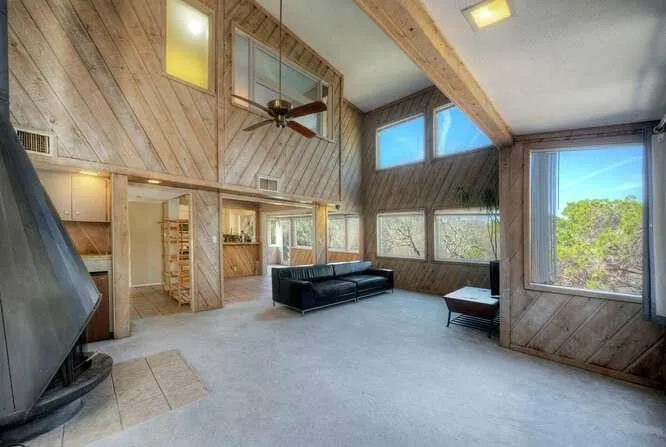 Current price, significantly below the average, reflects property condition. Create your own private retreat at 614 Sunfish, an architectural gem in the heart of Old Lakeway with all the right bones to make your vision a reality. Tucked beneath a canopy of mature trees, this multi-level home feels more like a secluded treehouse than a traditional residence. Its mid-century modern lines, rustic textures, and open layout provide a strong architectural foundation ready for your personal touch. A winding stone path and custom wooden bridge lead to the bold red front door, offering a preview of the home's one-of-a-kind character. Inside, the soaring great room with its dramatic ceilings, walls of glass, and a freestanding mid-century fireplace sets the stage for cozy nights and memorable gatherings. Diagonal cedar paneling, exposed beams, and open loft-style cutouts bring warmth, depth, and timeless appeal. The kitchen is bright and functional, with white cabinetry and modern appliances-easily adaptable for a future upgrade or a personalized reimagining. The dining area feels suspended among the treetops, creating an unforgettable setting for everyday meals or special occasions. A built-in wet bar and open-concept flow make entertaining effortless. Upstairs, the primary suite is a sun-drenched sanctuary, with windows that frame the natural landscape like art. Two additional bedrooms offer flexibility for guests, a home office, or creative space. Outside, a spacious deck stretches out into the trees, inviting you to enjoy morning coffee, evening stargazing, or peaceful solitude. Located on one of Lakeway's most storied streets, just minutes from Lake Travis, scenic trails, golf, marinas, and top-rated Lake Travis ISD schools-this home is a rare opportunity to own a well-built classic with endless potential. At 614 Sunfish, you're not just buying a home, you're investing in a foundation for your future retreat, surrounded by beauty, privacy, and possibility.