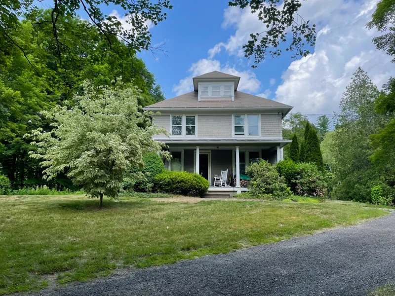 **NEW PRICE!**1914 Foursquare Farmhouse on 3.5 rolling acres with Barn. 3 Bedrooms, 2.1 baths. The residence, which is set up on a knoll away from the road, has spacious rooms and large windows that flood house with sunlight. Period Arts & Crafts interior detail evident throughout including leaded glass windows and stairway bannisters. Newer decorative wooden brackets were added in the kitchen and primary bath. Beautifully maintained hardwood floors throughout. Matching new floors were added recently in the kitchen; all original floors were restored upstairs and down. ATTIC: this massive space could be a lofty studio. 14KW Kohler GENERATOR; water filter system. NEW FURNACE Dec. 2023. Major quality renovation and kitchen wing added in 1980s. Classic columned front porch and large rear deck provide privacy from which to enjoy the bucolic setting. Barn is yours to decide how it will be used and includes an adjacent charming, small Milk House in the same architectural style as the house. Rural setting conveniently located between the centers of Woodbury and Washington. A gem from another era!