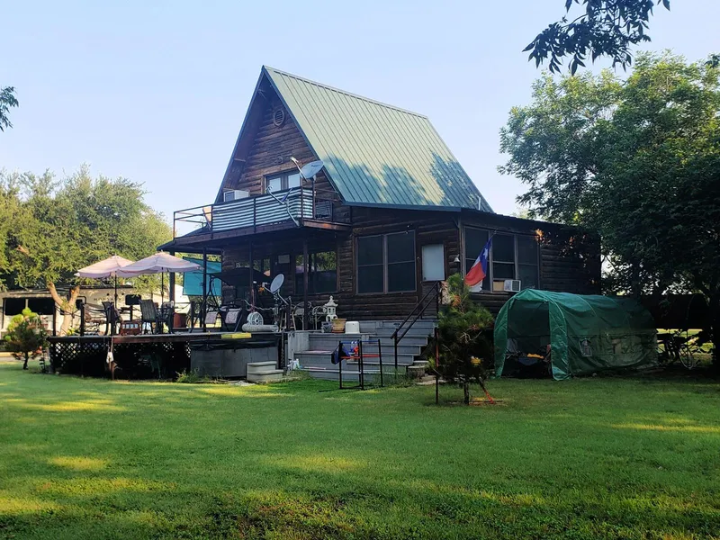 The cabin is surrounded by a canopy of mature trees providing excellent shade. Trees along the river and home consist of Live Oak, Pecan, Red Bud, Peach, Plum, Willow, Hackberry, and pine. There is a large peninsula that is heavily treed. It would be an excellent place to put more cabins. The peninsula currently serves as a sanctuary for wildlife. The field which serves as a buffer from the road is treed with mesquite and cedar trees and many wildflowers. The field serves as a privacy barrier but could be cleared and cultivated.