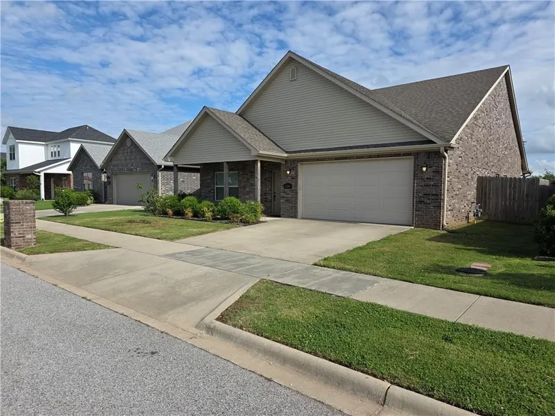 Stop looking! This all-brick, single- owner home located in a quiet neighborhood and great location. Perfectly blending peace with proximity to NWA's best amenities, including the University of Arkansas, this home is move-in ready. The soaring vaulted living room features a cozy gas log fireplace ideal for relaxing. Nine- foot ceilings throughout add spaciousness, complemented by new carpet in bedrooms and stylish wood-look tile in hallways and the hearth great room. The primary suite boasts an exceptional walk-in closet and bathroom. All bedrooms include walk-in closets and ceiling fans for comfort. The kitchen shines with a gas stove, ample pantry, and a generous island with granite countertops. Step outside onto the covered patio overlooking a large, fenced backyard with a scenic view, perfect for gatherings or quiet evenings. Don't miss this opportunity- schedule your showing today!