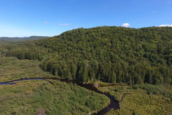 West Stony Creek is a classic Adirondack stream, which originates just beyond the tract's borders, near Pecks Lake, and flows eastward through the land before eventually joining the main branch of the Sacandaga River near Northville. Some stretches consist of long meandering pools that wind their way through the forest and other stretches that rush through pockets strewn with large glacial boulders. As the stream flows toward the north, its valley unfolds into an open beaver meadow which acts as a key sanctuary for resident wildlife and waterfowl.