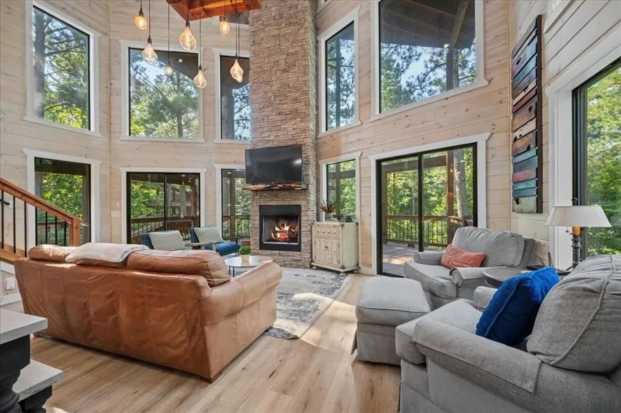 Welcome to Restoration Station a stunning 2 bedroom, 2.5 bath with loft, fully furnished luxury cabin blending rustic charm with modern elegance in PRIME location! Step inside to a light-filled living room with a towering wall of windows allowing nature in from every view, soaring vaulted ceilings, and a breathtaking custom chandelier. Cozy up by the gas stone fireplace in the living room, or gather in the spacious modern kitchen with beautiful granite countertops. Beautiful whitewash walls throughout the cabin that add a bright, airy feel and complimenting decor colors. Secondary bedroom downstairs, and bathroom with double vanities, ADA friendly handrails and a beautifully tiled shower. Don't miss the bed tucked under the stairs with a trundle for extra lounging or sleeping space that guest love! Double sliders off the living area to access the spacious deck with a gas fireplace, seating and grill for entertaining. Upstairs, the loft offers a fun game area with a console arcade, tv, seating space for entertaining and a half bath! Also, a spacious king bedroom with spa like en-suite, double vanities, beautiful tiled shower for two! Outdoor living is unmatched — enjoy a spacious deck that mostly wraps the cabin and leads down to a fire pit area, swings, and a hot tub under a private gazebo surrounded by forest and string lights. Circle drive with boulder rock accents that makes pulling a boat through with ease and ample parking for everyone! Extra perks - ADA friendly with ramp access, 2 HVAC units for upstairs and down that can be controlled as separate zones, EV car charger, recently winterized, all new a/c vents, extra storage area, and paved roads! Just minutes from Beavers Bend State Park, Broken Bow Lake, Choctaw Landing Casino, wineries, breweries, coffee shops, and hiking trails, this home offers the ultimate escape! Whether you’re looking for a personal retreat or a high-income producing vacation rental, this property is turn-key and unforgettable!
