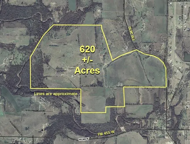 620+/- acres,paved road frontage on FM 2450, just north of W FM 455. Some flood plain, Clear Creek frontage, good hunting. Only 6 minutes from I-35! Buyer to verify all information.