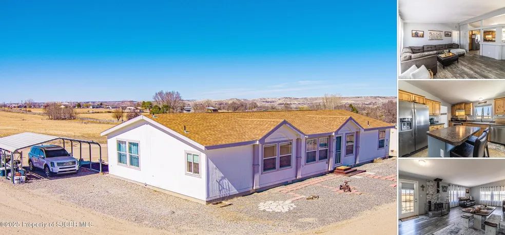 ''Estrella Blanca'' Escape to the peaceful charm of Sullivan Road, just east of Bloomfield, NM, where this modern and airy 4-bedroom, 2-bathroom Karsten home sits on a private one-acre lot surrounded by farmland. Enjoy the beauty of nature with irrigation access (consult your real estate broker) and easy access to Largo Canyon's breathtaking rock formations, Native American ruins, petroglyphs, and diverse wildlife. Step onto the back porch, light a fire, and soak in stunning valley views and vibrant sunsets--a perfect way to unwind. Inside, vaulted ceilings and high-endurance vinyl flooring create an open and inviting atmosphere. With two spacious living areas, a dining room warmed by a cozy wood-burning stove, and an updated kitchen, this home blends comfort with functionality. The kitchen is a dream--featuring an island, sleek stainless steel appliances, a dishwasher, an electric stove, a fridge with an ice maker, and a hidden pantry. The primary suite offers a retreat of its own, complete with an oversized closet, en suite bath, dual vanities, a garden tub, and a separate shower. The split floor plan ensures privacy, with bedrooms 2 and 3 sharing a second bathroom with a tub. A versatile mudroom could double as a small office, while the 4th bedroom can serve as an additional living space or media room. Outdoor perks? Absolutely! A wood or hay barn, chicken coop, wooden shed, and garden area make this home ideal for those who love space and self-sufficiency. Stay comfortable year-round with HVAC heating and cooling. If you're looking for a peaceful retreat with room to roam and explore, this home is a must-see! Schedule your showing today!