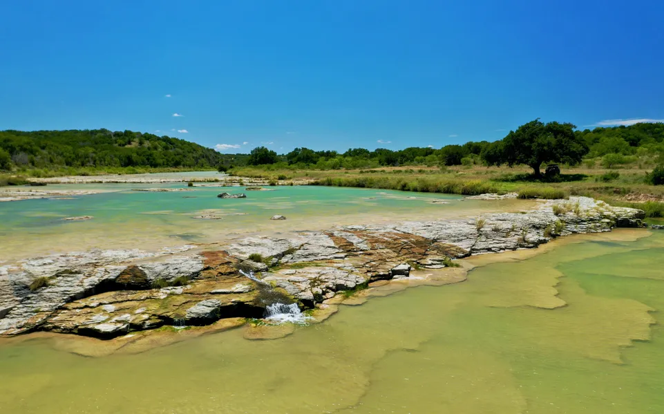 It was at the infamous Schreiner Family dinner party that Captain Charles Schreiner had each of his 8 children turn over their dinner plate to find out which part of the Schreiners legendary empire they would inherit. Francis Schreiner Jeffers ended up with 60,000 Acres with these 6,243 Acres serving as its headquarters. Grand oak trees and spring-fed creeks service the historic ranch headquarters. This property is highlighted by both sides of the James River within the Blue Mountain Range of the Hill Country.