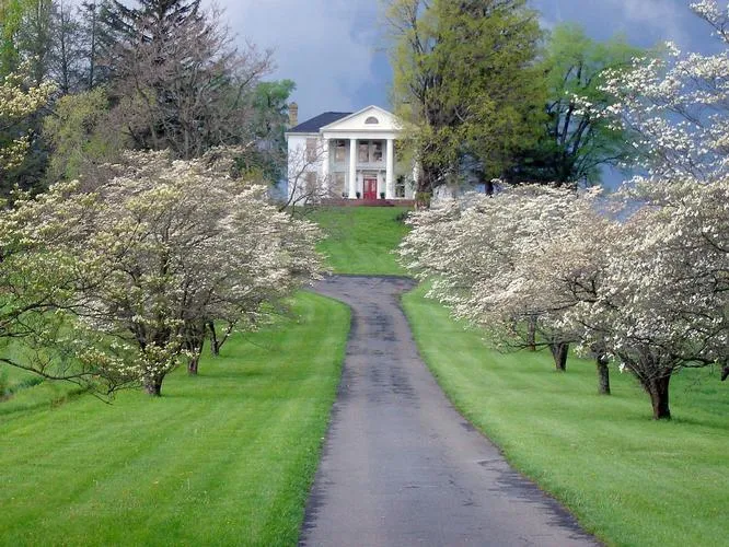 A large 1840 two story white brick manor house, recently renovated, sits on a knoll at the end of a long drive lined with dogwoods. The 4,700 sq/ft house has many wood burning fireplaces, antique mantels, four bedrooms, large living room, large modern kitchen and a 26x30 family room. From the house much of the crop land, pasture, ponds, barns, and woods are visible.