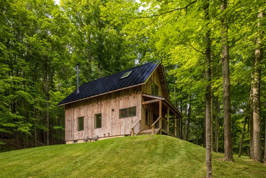 Perched on a hill at the end of a dead end road, this custom built modern cabin was rebuilt from the ground up in 2016 with every detail considered. Designed as an open, meditative space, the natural materials combined with the expansive windows on all sides, create an interior experience to feel a part of the surrounding woods outside. The open plan eat-in kitchen features an Eastern White Pine custom open kitchen cabinet frame with farmhouse sink, professional grade faucet, a slate countertop sourced from 1950s Columbia County school science lab, a Smeg oven and range and Smeg refrigerator. The living room is framed by a massive bank of windows looking into the forest. The Jotel wood burning stove is set on an Appalachian bluestone hearth, and a Haiku fan sits atop the cathedral ceiling. The full bathroom with sliding barn door, includes a clawfoot bathtub with rainshower. Ascend via the custom white oak staircase to the open, airy loft bedroom with a Velux manual venting skylight. Downstairs is the basement is currently being used as an additional bedroom on one side with the other for mechanicals, laundry and storage. Radiant heat throughout. On-demand Bosch combo boiler provides two zones of heat and domestic hot water for the home. Seven Buderus radiators with thermostatic heads to make each room a zone if desired. Nest thermostat for the main zone. Digital thermostat for basement zone. Face nailed premium white oak flooring, reclaimed antique heart pine joists, Marvin windows, and Schoolhouse electric fixtures are used throughout the house. The property includes 2 acres with a woodland trail and a small reflecting pond frequented by local wildlife. 1hr 45 min from GWB