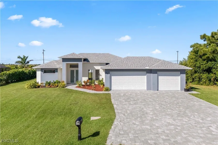 Welcome to your dream home in the heart of NW Cape Coral! This stunning newer construction, built in 2023, features 4 spacious bedrooms and 2 luxurious bathrooms, offering an impressive 2,000 square feet of elegantly designed living space. Set on an OVERSIZED TRIPLE LOT, you'll enjoy plenty of room for outdoor fun, gardening, or simply soaking up the sun. As you enter, you'll be greeted by a bright, open-concept layout with beautiful tile flooring throughout, adding a sleek vibe that makes maintenance a breeze. The remarkable tray ceilings create an airy atmosphere, enhancing the spacious feel. The heart of this home is the gorgeous kitchen with eye-catching granite countertops. Cooking or entertaining will be a delight! The living area is perfect for relaxation and filled with natural light, while each bedroom provides a cozy retreat to unwind. Step outside to enjoy the expansive outdoor space. Imagine creating a lush garden, setting up a gathering spot, or just relaxing under the sun. Plus, with a 3-car garage, you'll have plenty of room for your vehicles and storage. Located in a desirable area with city utilities already in place, this home is NOT IN A FLOOD ZONE, offering peace of mind and comfort. Discover the charm of NW Cape Coral, where modern living meets a friendly community atmosphere. Don't miss this incredible opportunity! Schedule your visit today and see all that this fantastic home has to offer!
