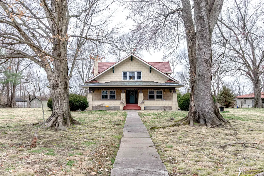 So much potential in this early 1900's craftsman style brick home boasting 6bdrms, 4 baths, beautifully situated on 4.35 acres. Lge inviting front porch, living room w/wood burning fireplace, formal dining room w/window seats, lge. eat in kitchen w/original icebox used as cabinets. Primary bedroom, 2 additional bdrms, and Laundry room on main floor. Beautiful open staircase, hardwood floors, enclosed back porch, clean steam heat, c/a, full unfinished basement, over sized 2 car detached garage. Property backs up to Hays Kennedy Park. Would be perfect for lge family, Airbnb, wedding venue. The possibilities are endless. Private yet close to town.