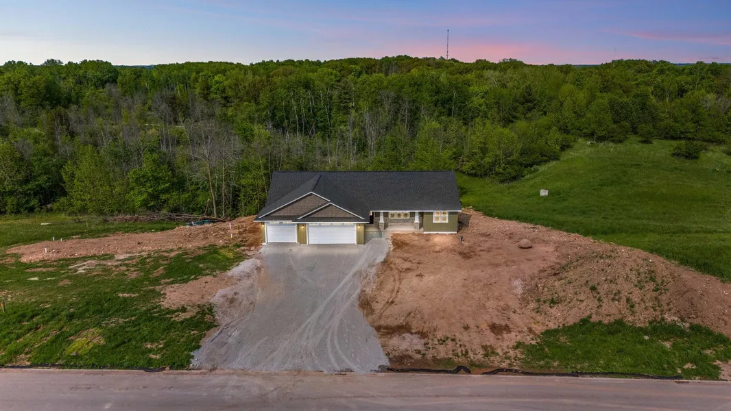Brand New home! 3 bedroom 2.5 bath 1 story walk out home over looking your approx. 1.69 acres with woods backs up to Devils River State Rec Trail. Great floor plan split bedroom design. Kitchen w/appliances, granite counter tops, pantry & large dining area w/patio doors. Primary bedroom huge closet, full bathroom double sinks & granite countertops. 1st floor laundry rm. folding counter. Vaulted ceiling in living room w/ gas FP. Mudroom area off of garage which could hold approx 4 vehicles w/ an overhead door to the backyard & stairs to basement. Concrete driveway width of the garage to the road, concrete walk way to front porch, 12x18 deck with TimberTech floor & aluminum railing is included in price. Listing agent has an interest in the property.