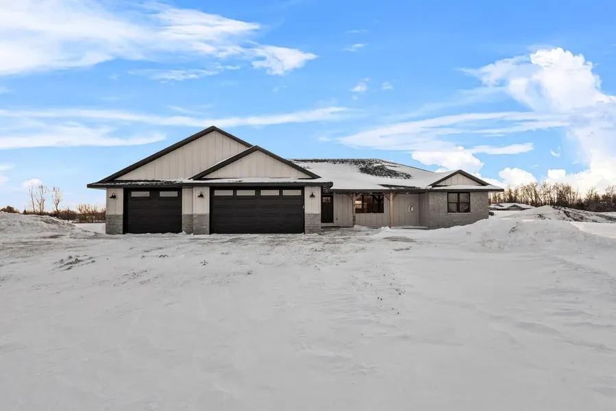 Beautiful & brand new sprawling 1 story home with split bedroom design. Custom made gorgeous cabinets which are soft close, huge mud room area with closet & locker style off of the oversized finished 4 stall garage with and overhead door to backyard, water spigot, floor drain and large closet. 1st floor laundry room, huge kitchen offering granite counter tops, walk in pantry, patio door with a view of the countryside. Primary bedroom w/ large tiled walk in shower, double sinks, huge linen, along with walk in closet lots of shelving & hanging. Floor to ceiling stone gas fireplace, vaulted ceiling in living room. Basement w/ egress window, stubbed for another bathroom & access to the garage! Concrete driveway the width of the garage to the road. Listing agent has an interest.