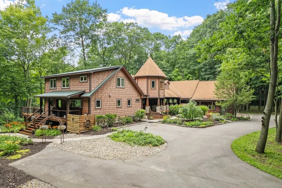 Welcome to luxury and breathtaking views at this secluded 23-acre estate atop South Haven's Black River. Surrounded by lush gardens and serene outdoor spaces, this West Michigan masterpiece is equally stunning inside as it is out. The main home boasts a massive deluxe primary suite with natural light, cathedral ceilings, exposed beams, a wood stove, heated floors, a loft, and a beautiful private office/library. The en-suite offers dual sinks, solid surface countertops, a tile shower, and a large walk-in closet. High-end finishes continue as you step into a sun-drenched living space and the home's elegant and sophisticated kitchen with custom cabinetry, granite countertops, and upscale appliances. Downstairs, you'll find additional living space, a charming kitchen, and a thoughtful wine cellar with access to the home's rear patios and outdoor spaces. Adjacent to the main home is a wonderful guest house with two bedrooms, 2 full baths, a kitchen, a fireplace, and a rear deck. Other amenities include a renovated private apartment with a bedroom, full bath, kitchen, flex space, a heated 3-stall garage, a screened gazebo with power, and a heated 1200 sq ft pole barn. Experience a tour of this breathtaking sanctuary before it's gone. Legacy properties like this don't come around often.