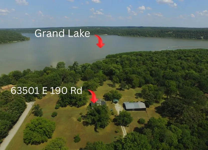 Serenity & tranquillity awaits at this 10 acre, 661' Grand Lake waterfront estate. Once through the iron gate, the manecured yard, abundant flowers, mature trees & water views are stunning. The screened in wrap around porch & new waterside deck welcome you home. An old world charm rock home made with hand hewn old growth wood throughout boasts 3 lg bedrooms & 2 full baths. An island kitchen is open to the dining room & living room w/ wood beams & rock fireplace. Brand new class 3 impact resistant /160 mph rated roof and fresh paint. 40x80 shop/barn, 20x50 lean to, corrals, pens, iron fence, crossfenced, cellar for storage/safety. All nestled at the top of Grand Lake, would make a great hobby farm, fishing lodge, corporate retreat, legacy estate, or RV park. No HOA, restrictions, or flood.