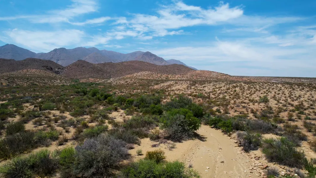 The terrain is at once rugged and majestic: ridgelines tumble into wide desert flats, with native vegetation and seasonal creeks threading through the land. Views are unbroken for miles in every direction, offering a sweeping sense of solitude and scale that is increasingly rare.