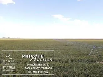 Contact United Country Stutzman Realty & Auction to learn more about this irrigated farmland located in Southeast Colorado. Situated between the communities of Springfield and Villas, this 640 acre tract is available by Private Auction - Bid by Telephone - Bid by December 13, 2022. To learn about the bidding process, inquire about the high bid, or to place a bid, call Tobias Stutzman, ALC, Associate Broker at the Ulysses, KS office.