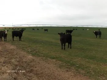 There are four center-pivot, sprinkler irrigation systems and four wells on this farm. Three of the sprinklers are 85 Zimmatics with small tires and one is a 90 Zimmatic with 38 tires. All sprinklers are in good repair, have drops on 60 spacing and are each nozzled for 300 gpm. There is a natural gas engine with a generator at each well to supply electricity to a sprinkler and to a 60hp submersible motor and pump. The subs are approximately 4 years old. The owner states that the wells are approximately 400 ft. deep and believes that additional deeper wells could be developed to supply more water. Two sprinklers are currently being operated at the same time.