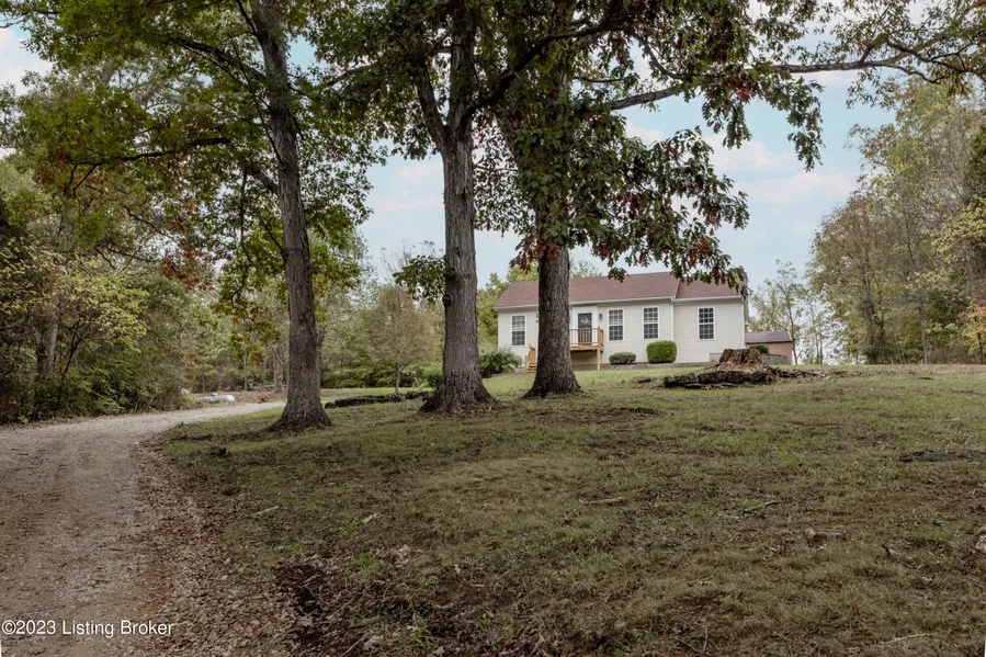 Adorable split bedroom plan home with unfinished basement on 9 wooded acres in Oldham County! Newly painted with lots of upgrades, this 3 BR, 2 full bath home is ready to go. Wood floors in living room, tile in kitchen and baths, walk in closet in primary bedroom. Nice covered porch in rear, unfinished basement with one car garage. Property is cleared around house with rest wooded land. Several building sites with approximately 763 feet of road frontage. Large metal building needs some tlc.