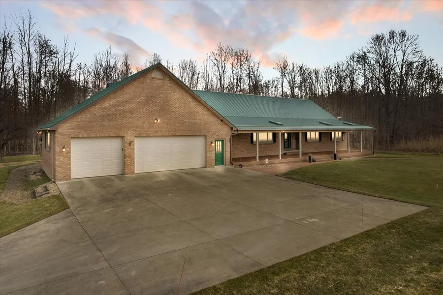 Simply Paradise! This 3988 sq ft Brick Ranch home sits 600ft from the road on a winding driveway with 25 acres of wooded property which provides lots of privacy. A winding trail throughout the property leads to a stream at the back of the property, and is excellent for hunting. Home provides a spacious 4 bedrooms, 3.5 bathrooms, Pella windows throughout and a front porch (12x76) w/timbertech flooring. A glamorous master bath w/massive walk in tiled shower, quartz countertop, heated floor was just remodeled in 2018. The huge kitchen has hardwood floors, custom made hickory cabinetry, and a walk in pantry. Vaulted ceilings in the kitchen, great room, sunroom, and enclosed hot tub room. Solid oak interior doors throughout. New metal roofs and skylights in august of 2020. New hot water tank in 2019, Generac 24Kw back-up generator was installed in Nov.2021. Enjoy the partially finished full basement that includes a full bathroom, all walls have sprayed foam insulation and is framed for finishing with 3 different entrances. Home has an attached 3 car garage. Outbuildings include 3 large pole barns, 42x68-14 ft high ceilings-3 insulated overhead doors 18'2"x12', a 32x64- 10ft ceilings-2 overhead doors, last one is 37x59, all have concrete floors and LED shop lighting. There are also 2 wood sheds 12x18, and 6x12. A Brick screened gazebo (15x15) overlooks a large pond with an 8 foot waterfall. Sure to please is a Shooting range with an earthen backstop and an Archery range. This home has everything you have dreamed of.