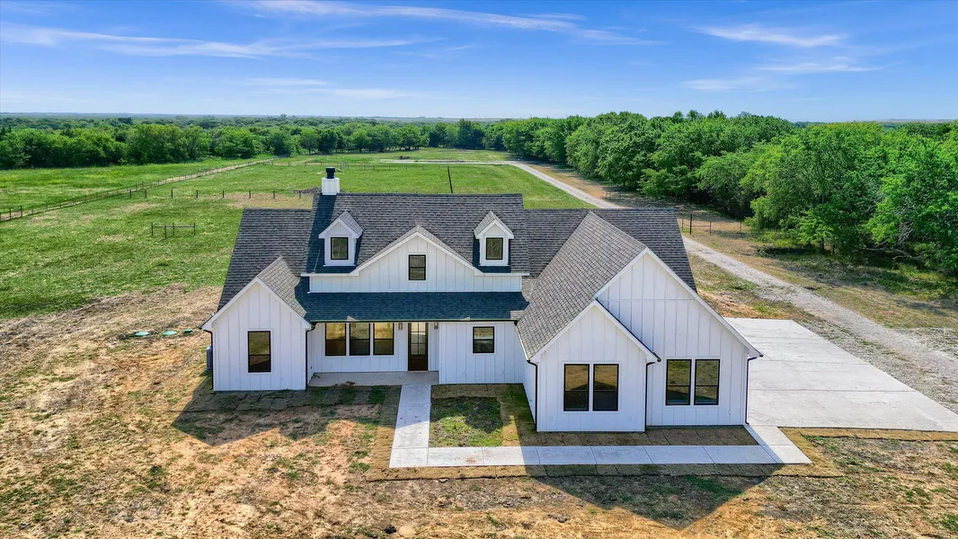 This newly constructed home in Collinsville sits on 12.6 acres, featuring a grand layout with a spacious living room that opens to a private patio with a wood-burning fireplace. The open concept kitchen includes an island for dining and a separate eating space. It boasts large bedrooms and expansive bathrooms for ample movement. The master suite is equipped with an electric fireplace and a private patio entrance. The master bathroom features a sizable tub, a separate shower, and dual vanities. A large walk-in closet provides access to the exceptional laundry room adorned with elegant cabinetry. *You won't want to leave this room* The room above the garage is finished and versatile, suitable as a game room, media, bar, or exercise area, along with an office area. The property is complete with fenced, cross fenced with a pond, showcasing both trees and open pasture, along with a seasonal creek running along the south side. An additional pad site ready for a shop with rough in plumbing.