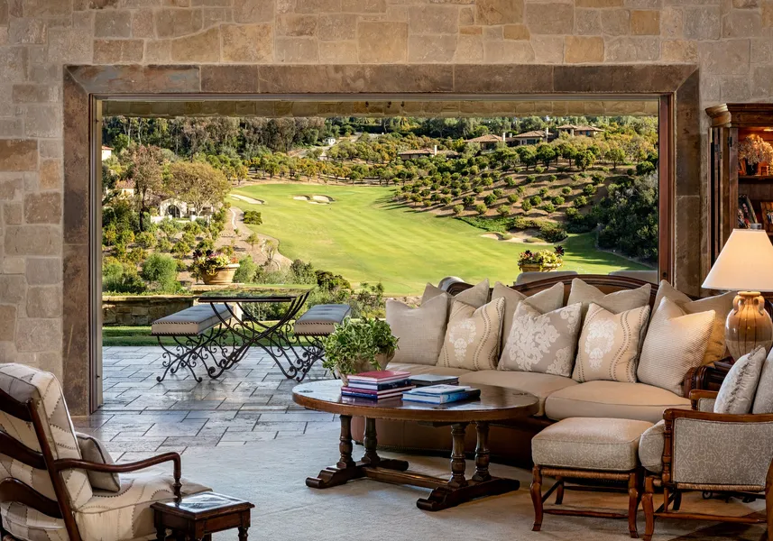 Located within the prestigious Estates enclave in the Bridges at Rancho Santa Fe, this ultra-private, single-level residence sits atop a unique peninsula that overlooks the magnificent 15 th Fairway, emphasiz ing extraordinary panoramic golf course views in one of the highest-rated and most luxurious guard-gated golf course communities in the USA. This exceptional home was custom-designed not only to capture breathtaking views from its spacious room s , but also to take advantage of the site's unique privacy and sunlight. The user-friendly floor plan features 4 ensuite bedrooms, chef's kitchen, great room , game room, theater, formal dining room, wine cellar and office. A covered , heated outdoor loggia leads to the pool whose leading edge blends seamlessly with the captivating views. A one-bedroom, detached guesthouse and 4 1/2 garages complete the landscape.