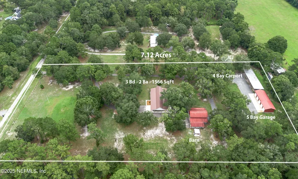 Rare opportunity for Clay County acreage. Beautiful 3 bedroom, 2 bath brick home on 7.1 acres with so much to offer. There's plenty of room to bring all the toys and you don't have to worry about an HOA or CDD fees! 2 stall attached carport, pole barn with heated and cooled office space, half bath and lots of storage space, 5 car insulated garage with finished walls in 2 bays and a 5-stall open pole barn. Lots of asphalt to get you around the property on pavement. You can enjoy the peaceful views of deer and turkey from front porch or the back porch. The home is move in ready, kitchen comes equipped with range, microwave, dishwasher and refrigerator. There is a separate laundry room. It is a split floor plan with a large owner's suite, both baths have been recently updated. New metal roof installed 2016. Property is fenced. Don't miss out on this one-of-a-kind property! Clay County Zoning is AR.
