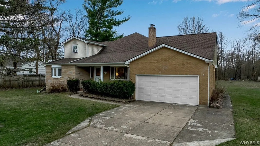 Welcome to 6438 Engel Dr. located minutes outside the village of Hamburg, NY. Here is your opportunity to become the 2nd owner of this 2,092 sq. ft home situated on 1.20 acres on a quiet, dead-end street. Maintenance free brick & vinyl exterior with double wide driveway & attached garage. On the 1st floor you will find a generously sized living room with plenty of natural light, formal dining room with new sliding door & spacious kitchen with an abundance of cabinetry. Rounding out the first floor is a 19x12 primary bedroom, full bathroom and office/den. The second floor features 2 bedrooms, an additional bonus room for bedroom/hobby space, another full bathroom & ample closet space. Hardwood flooring throughout most of the home (some under carpeting). Updated mechanics include newer Lenox High Efficiency Furnace, sump pump ‘21 & HWT ‘18. Dry basement offers additional opportunity for hobby space. Step outside into the expansive backyard, where endless possibilities await. Deck with vinyl railing & unilock pavers, 2 Sheds & electrical in case you desire to add a pool. Open house scheduled for 3/23 from 1pm to 3pm. Offers to be submitted prior to 12pm on 3/26/2024.