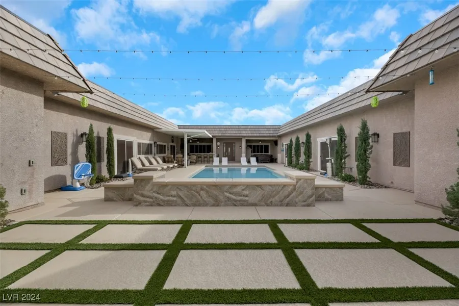 Nestled in Mission Hills Rural Preservation, this stunning home sits on a spacious acre with NO HOA, blending luxury and outdoor living. The courtyard features a 43' x 21' pool with waterfalls and a wet deck. Size no longer allowed under new regulations. Multiple outdoor spaces include a covered patio with misters, a BBQ/bar, a spa area with a Marquis hot tub, and a pergola with a fire pit perfect for entertaining. The primary suite boasts a custom walk-in closet, shoe closet, accent wall, and double barn doors leading to a spa-like bath with a Jacuzzi, granite wall, and private garage entry. The family room, anchored by a bar, offers ample space alongside a raised formal dining area. The chef kitchen has a large island with seating for the whole family. With no rear neighbors, a remote-controlled gate provides access to RV parking. Just minutes from Las Vegas with multiple parks near by. This meticulously designed home offers comfort, style, and endless outdoor possibilities.