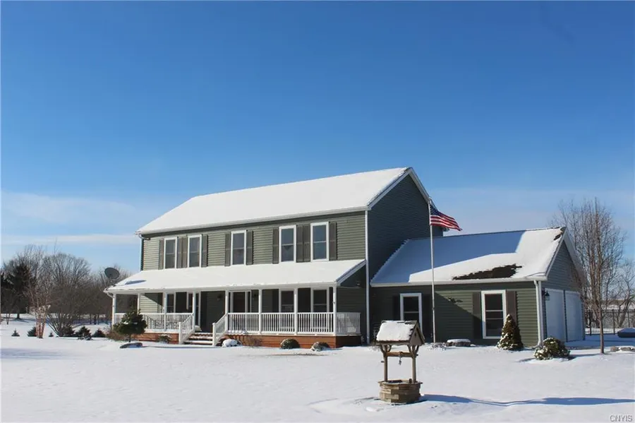You owe it to yourself to visit this immaculate 2600+ sq. ft. Colonial, located on a scenic country acre bordering forever farmland and within 15-20 minutes of Syracuse, Auburn, Baldwinsville, Skaneateles and NYS thruway exit 40. The rear double deck overlooks the 18 x 36 in-ground heated pool and an incredible sunset view. Features include a first-floor master bedroom, granite counter tops, stainless steel kit appliance suite, 5th & 6th bdrm option, 650 sq. ft finished basement, seamless gutters, storage shed, professional landscaping, updated lighting and fixtures, and new flooring. The plantation style front porch is ideal for relaxing or entertaining. The award-winning J-E school district offers Pre-K for 3-year-olds and college credit courses for HS students.