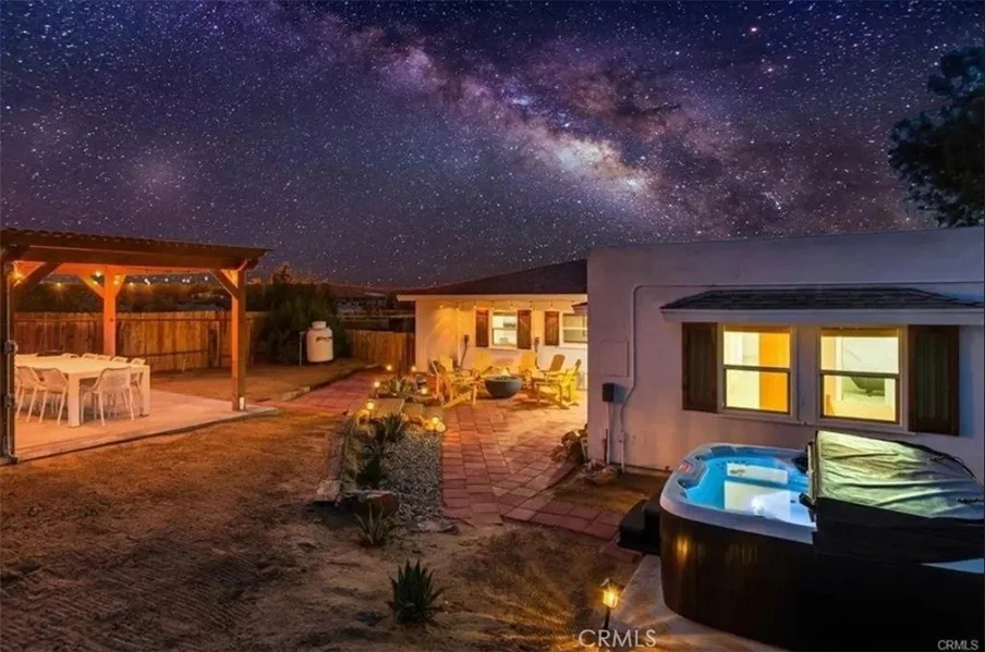 Turn-key desert retreat with income potential. Updated 4-bed, 2-bath, 1,806 sqft home on a 0.55-acre fenced lot with wide mountain + desert views. Stylish interior with polished concrete floors, ductless mini-split system, and a designer kitchen with concrete counters and full tile backsplash. Outdoor living shines with a hot tub, propane fire-pit, BBQ zone, covered patio, and space for hammocks + stargazing. Detached 2-car garage/studio already wired with electric and plumbing, ideal for a future ADU or guest suite to boost STR revenue. Quiet setting yet minutes to Joshua Tree National Park, shops, and dining. Turn-key, low-maintenance, and STR-friendly, perfect for investors or a personal desert escape.
