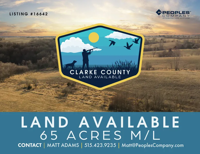 Peoples Company is representing 65 acres (to be surveyed) of recreational land with an ideal blend of mature timber, seeded grass/alfalfa mix, and a pond with over 2 acres of surface area. The property is located on paved road Hwy R45 just south of New Virginia, Iowa, and near the Warren / Clarke County line. This convenient location allows for a 30 minute commute to and from the Des Moines Metro and all its amenities. There are approximately 37.95 FSA cropland acres currently seeded to grass/alfalfa with a CSR2 of 33.2. There are several building site options with south-facing views overlooking the pond and backing up to the mature timber draw. The pond was built in the late 1980s / late 1990s and is fed by a small, meandering creek from the west side of the property.