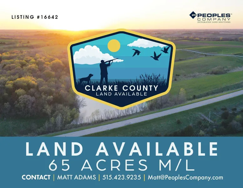 Peoples Company is representing 65 acres (to be surveyed) of recreational land with an ideal blend of mature timber, seeded grass/alfalfa mix, and a pond with over 2 acres of surface area. The property is located on paved road Hwy R45 just south of New Virginia, Iowa, and near the Warren / Clarke County line. This convenient location allows for a 30 minute commute to and from the Des Moines Metro and all its amenities. There are approximately 37.95 FSA cropland acres currently seeded to grass/alfalfa with a CSR2 of 33.2. There are several building site options with south-facing views overlooking the pond and backing up to the mature timber draw. The pond was built in the late 1980’s / late 1990’s and is fed by a small, meandering creek from the west side of the property.