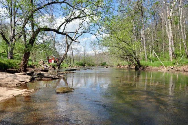 The farm is blessed with year-round water sources. Muddy Creek flows for nearly mile. Several large hollows, many ephemeral streams flow during rain events and snow melt create topographic relief throughout the property. There are also natural springs. The water source for the primary residence is an artesian spring which runs year round. This spring is fenced off and includes professionally installed intakes which feed into a buried 1000-gallon concrete storage tank. Because the water source is gravity fed, there is still water when the power is out. There is also a pump under the house to provide additional water pressure.