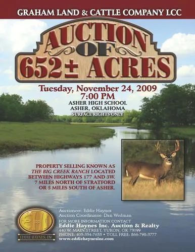 A Cattlemen's Dream & a Sportsman Paradise! Big Creek Ranch sells at Auction Tuesday, Nov. 24th, 2009 at 7pm at Asher High School in Asher Oklahoma. Surface Rights only. PROPERTY SELLING KNOWN AS THE BIG CREEK RANCH 652± contiguous acres located in McClain and Pontotoc Counties less than 1 mile from 3 major highways: