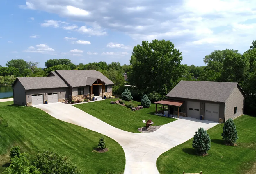 Custom built Lake House with large outbuilding on 1 acre lot bordered by common ground. This walkout ranch home features 2x6 framing, hickory kitchen cabinets, knotty alder interior doors, Pella windows and doors, insulated laminate flooring, open floor plan with 9' to 13' ceilings, gas range cooktop, ceramic tile bathroom flooring, large walk-in shower, huge walk-in pantry, all bedrooms have walk-in closets, large covered cedar deck, unique rustic interior & exterior building materials, sprinkler system, huge manicured lawn and landscaping, incredible lake views, and no need for flood insurance. The 40x42 detached climate controlled garage features 10'x12' overhead doors, automatic openers, floor drain, shop sink, 220 electrical service & large office area with bathroom facilities. Catch Walleye, Bass, Crappie, Bluegill & Catfish in the sandpit lake that can reach 55ft depths. Enjoy lake living on the huge sandy beach with fire pit and floating boat dock. Seller is licensed broker.