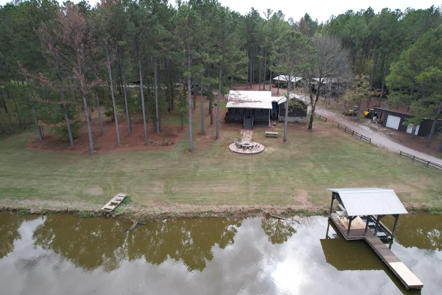 One of the most notable features about Pinewoods is the scenic 12 acre lake lying directly behind the cabin. This is a very nice size lake that has been professionally managed in the past...it has a covered dock with one slip for a boat and the banks around the edge are manicured. If you like to fish, you will certainly enjoy sitting on the bank with a bream buster or easing around here in a jonboat catching bass, bream and crappie! In addition, the landowner has done some duck hunting on a flooded area near the upper end of the lake.