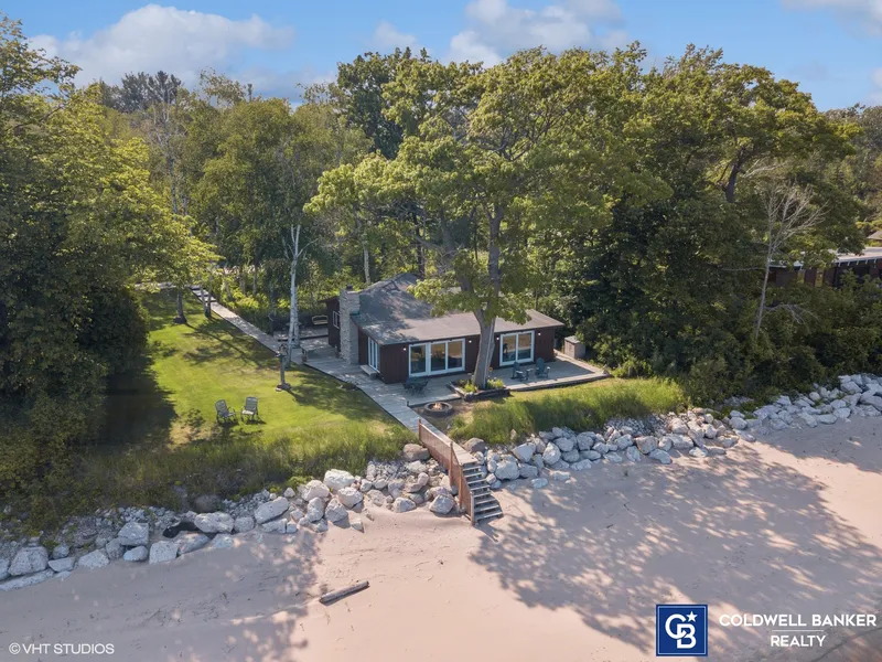 Fall in Love with this Lakeside Estate that features two homes and an additional lot. Privately located on the shores of Lake Michigan with 96 feet of beachfront. The inspiring architecturally designed homes offer the perfect blend of comfort, elegance, and breathtaking views. As you step inside the Ranch style home, you will be greeted by the warmth of Mississippi Cyprus Hardwood floors throughout the open floor plan seamlessly connects the living spaces. Natural light floods the interior, highlighting the attention to detail and craftsmanship. The Second home features 2 bedrooms 1 bathroom, 2 car attached garage, and a large deck with stunning lake views. Do not miss the opportunity to own this exquisite lakefront retreat.