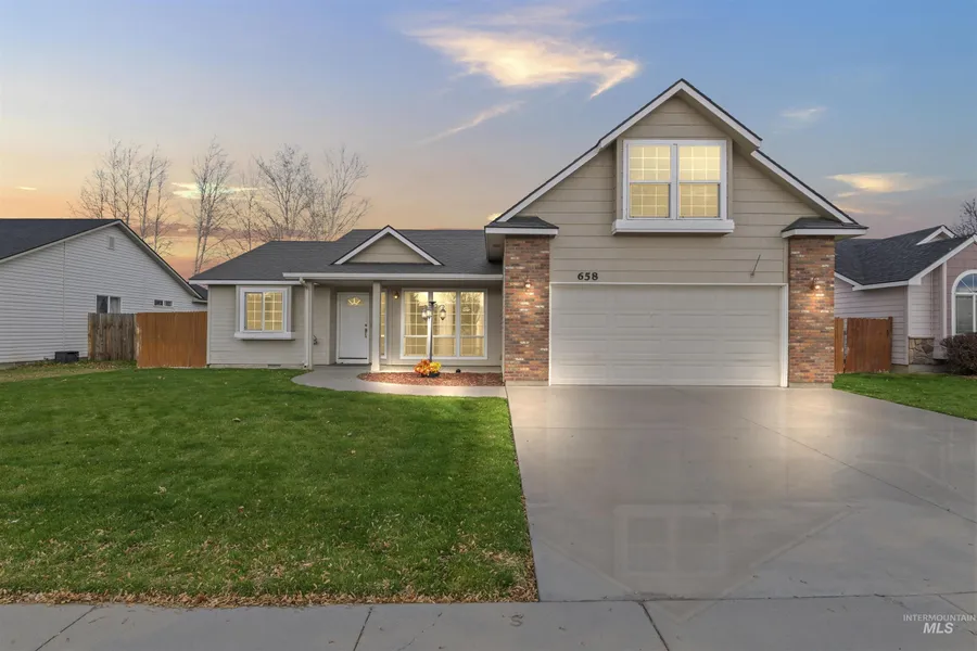 Quality construction defines this 3-bedroom, 2-bath, 1,556 sq ft home with a spacious bonus room, located in the established Wild Meadows neighborhood of custom homes. Set in a quiet yet convenient Kuna location, it offers close proximity to local amenities, a neighborhood park, and a dog park just a half mile away, along with easy access to Swan Falls, the Snake River, and Indian Creek. A covered front patio provides an inviting space to enjoy Kuna’s renowned sunsets, while the back patio is enhanced by a retractable awning for comfortable outdoor living. Inside, the split-bedroom floor plan offers privacy, while the vaulted great room is filled with natural light from large front windows and anchored by a striking corner gas fireplace. The kitchen and dining area feature a breakfast bar, large pantry, and upgraded appliances, creating a functional and welcoming space. Main living areas have been recently repainted and updated with luxury vinyl plank flooring. Additional upgrades include new windows, a sliding glass door, and a newer HVAC system. The generous upper bonus room offers exceptional flexibility and could easily serve as a fourth bedroom, office, or media space. Surrounded by mature landscaping, this thoughtfully maintained home blends comfort, quality, and an exceptional Idaho lifestyle.