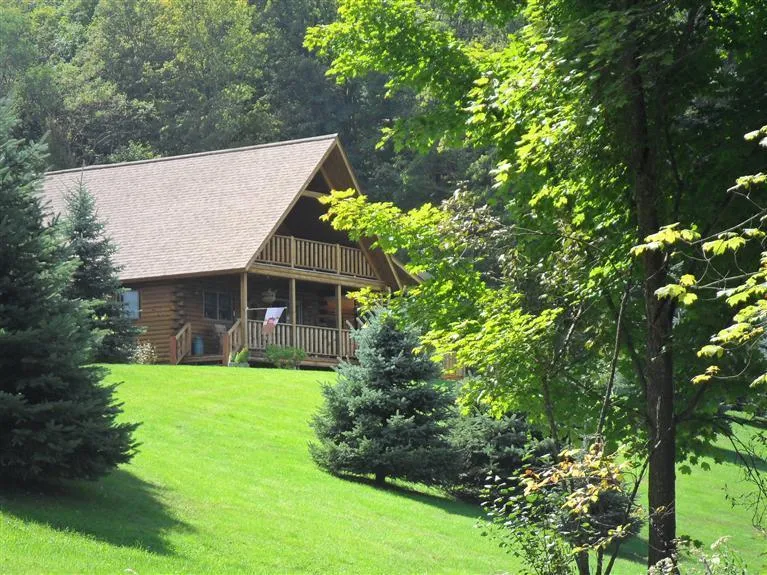 This pristine BEAVER MOUNTAIN LOG HOME sits on 135.9 ACRES with sweeping DELAWARE COUNTY VIEWS offering privacy, open meadows, woods for HUNTING, a system of TRAILS, large SPRING FED POND, fruit trees, berry bushes, blue spruce & much more. The home has an open floor plan with wonderful sunfilled rooms. It provides great space for gatherings indoors or out on the covered wrap around porch & expansive deck. The 20 x 26 living room has a soaring cathedral ceiling and impressive floor to ceiling COBBLESTONE FIREPLACE. The beautiful Woodmode kitchen with corian counters & large dining room are both open to the living room. Two bedrooms, a full bath & laundry complete the 1st floor, while from the 2nd floor open den area you will find the Master Suite, with huge closets, bath & sliding doors to covered deck. 8 zone heating system: basement & 1st floor have radiant heat, the 2nd floor baseboard hot water heat. There is a heated 2 car attached garage and a 30x60 HEATED DETACHED GARAGE.