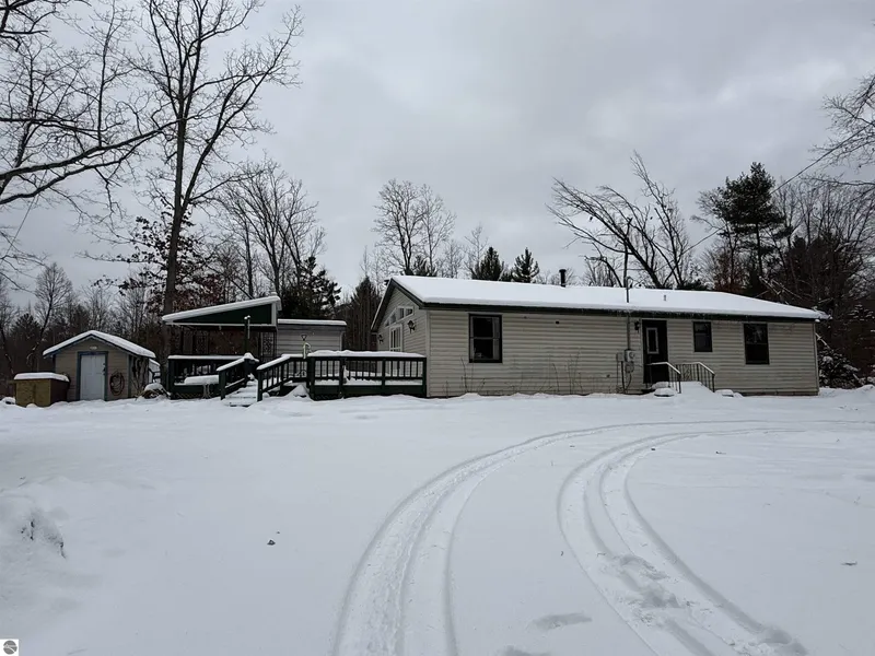 No trespassing on property without scheduled appointment. SHOW BY APPOINTMENT ONLY. Set on a scenic 21.5 acres, this 3-bedroom, 2-bath home offers space, privacy, and endless opportunities to enjoy the outdoors. Inside, you’ll find an open living room warmed by a cozy wood-burning fireplace that flows into the kitchen and dining area—perfect for everyday living or gathering with family and friends. Outside is where this property really shines. A large garage and multiple sheds provide plenty of storage for equipment and toys, while the outdoor wood burner adds efficiency and comfort. Enjoy the views from the deck, explore the established trails, or settle into the heated deer blind right on the property. Much of the land is already fenced, making it ideal for recreation. Best of all, the end of the road opens directly into thousands of acres of Huron National Forest, with easy access to snowmobile and ORV trails. Whether you’re looking for a peaceful retreat, a recreational base camp, or a place to enjoy the outdoors year-round, this property checks all the boxes.
