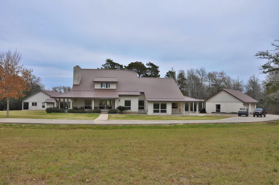 A nice entrance and private paved road greets you at the entrance. The road winds through the Post Oak trees and by a newer metal horse barn on slab with tack room and 4 stalls ready for your horses or livestock. Then the road turns and runs into a great circle drive around the large shop with bathroom on an elevated slab. The home also has a double covered carport on slab. The Seller spared no expense on the concrete and materials on building this keeper rock ranch house.
