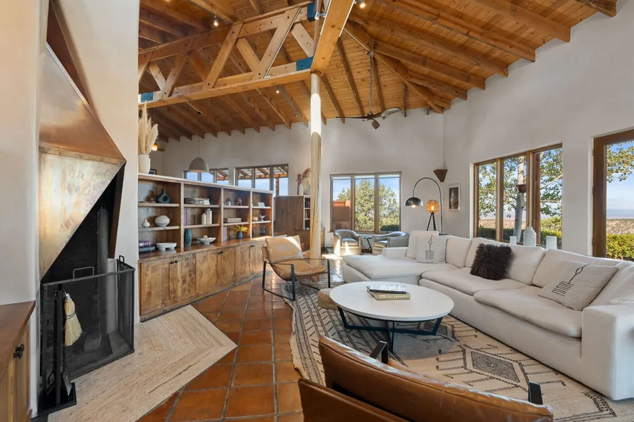 Stunning 3-bedroom, 3.5-bath home in Vista Redonda professionally sited on 5 ridge-top acres of piñon trees and breathtaking views of the Sangre de Cristo and Jemez Mountains. Constructed by renowned builder Dennis Sayer, this residence showcases exceptional workmanship and reflective design. The pitched roof and soaring beamed ceilings create an airy, inviting atmosphere, while the hard plaster walls and polished Saltillo tiles add timeless elegance. Upon entering, you'll find a spacious great room that flows into a dining area and a well-appointed eat-in kitchen. The office, complete with built-in desk and bookcases, provides a quiet retreat, while the kiva fireplace adds warmth and character to the space. The home features two en-suite bedrooms in each wing, ensuring privacy and comfort for guests.. In addition, there is a detached 133 sq. ft. studio/casita. Multiple outdoor areas invite you to enjoy al fresco dining and entertaining, including a delightful sunrise breakfast patio where you can soak in the morning sun with a cup of coffee. Natural light floods the home through plentiful skylights, windows, and glass doors, begetting a bright and welcoming environment. Additional highlights include a heated 2-car garage and newer boiler and water heaters. Just south of Vista Redonda is the Village of Tesuque, its neighborhood gathering spot Tesuque Village Market and the contemporary restaurant and bar, El Nido. Easy access to The Santa Fe Opera and downtown Santa Fe.