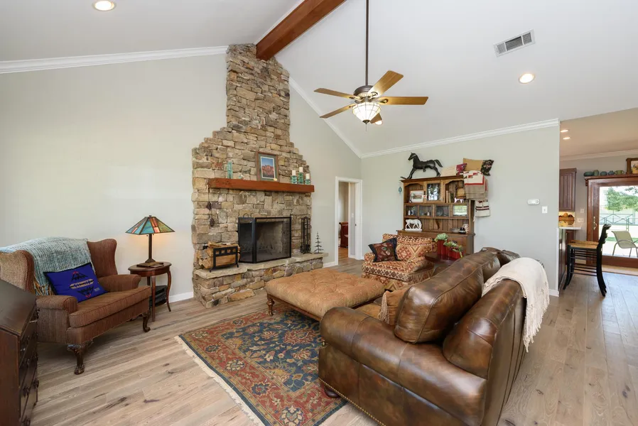 Stunning, pristine property.Metal workshop with insulated walls, plumbed for bathroom,T elephone and satellite. Barn with tack room, wash rack, 2 open and 2 enclosed stalls, 2 pasture pens, portable loafing shed. Electricity and water available all pastures. Cattle working pens and loading shutes.Garden area, chicken coop,two covered patios, kennel, great for entertaining.Co op water available. Kit app new.