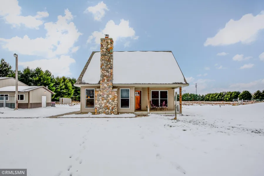 Charming Custom Built Country Cottage on 5 Acres in Hugo. This home has it all, charm and space. Once you walk through the front door you are invited into the main living area of the home which boasts gorgeous wooden beams, a stone fireplace, and unique acid-stained concrete heated floors. The wooden beams are carried through to the kitchen, which adds character and warmth to the space. The main floor bedroom is located in the rear of the house and has a lovely view of the pasture. The stairwell leading to the second floor is open and bright. Upstairs is anchored by two bedrooms and a bathroom. The outdoor space is just as stunning as the interior of the home. The pole barn has plenty of space for your equipment and toys. The attached shop is the perfect space to tinker and watch a ball game. The outdoor space includes a chicken coop, a goat shed, and a horse lean-to that are fenced with wood and electric. There is also underground electric fence for dogs. Yes, you can have it all!