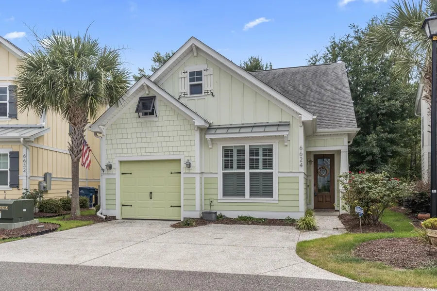 Welcome home to coastal luxury in a gated community that's just 650 yards from the Atlantic Ocean! This stunning home is one of just 8 exclusive properties in a private gated community, each one unique in its own way! Situated on a serene lake, it features a 27' x 10' treated wood deck with picturesque water views, as well as access to a community dock perfect for fishing or relaxing. The deck also has a custom remote controlled retractable awning that covers the entire back patio for shade. Inside, the first-floor master bedroom boasts elegant upgrades, including a tray ceiling, crown molding throughout, and a custom-tiled walk-in shower with bench seat in the master bath. The home also offers high-end finishes such as plantation shutters, soaring cathedral ceilings in the living area, custom closet shelving, and 42” wall cabinets in the kitchen. The kitchen is spacious and complemented by stainless steel appliances including a gas range, beautiful tiled backsplash, and luxurious granite countertops. The living room lets in tons of natural light with an oversized sliding glass door that overlooks the lake, enjoy the ease of remote controlled blinds to cover the door or raise them up to take in the views. As a BONUS, upstairs you will find a versatile LOFT space that can be used as a second living area, office, game room, extra sleeping quarters, or a cozy retreat for relaxation. The options are endless! A garage with epoxy flooring and pull down attic storage is great for all of your storage needs. Landscaping is included in the HOA fee for low maintenance ease of living. This move-in-ready home, just steps away from the beach and close to restaurants, shopping, dining and more, won’t last long—schedule your showing today before it’s gone!